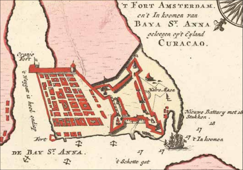 "'t Fort Amsterdam en t inkoomen van Baia St Anna int groot gelegen opt Eijlant Curacao", 1680. Bron: Amsterdam Bibliotheek UvA. Punda en Fort Amsterdam., gezien vanuit het westen.