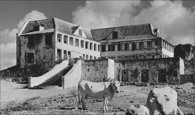 "Curaçao ligt op 12° noorderbreedte en 69° westerlengte, niet meer dan zo’n 70 kilometer ten noorden van het Zuid-Amerikaanse vasteland en heeft een oppervlakte van 444 vierkante kilometer, ongeveer een derde van de provincie Utrecht; het eiland is 60 kilometer lang en heeft een breedte die varieert van vier tot tien kilometer. Het is zuidoostnoordwest georiënteerd. De gemiddelde jaartemperatuur fluctueert tussen de 25 en 31° C en de gemiddelde neerslag bedraagt zo’n 550mm. De regenval is echter onregelmatig, meestal in de vorm van een stortbui, en het water gaat voor een belangrijk deel weer door verdamping verloren. De kern van het eiland bestaat uit vulkanisch gesteente. Het landschap is golvend tot heuvelachtig, met de Christoffelberg in het uiterste westen als hoogste punt, en begroeid met laag struikgewas, de karakteristieke divi-divi bomen en cactussen. De noordoost passaat, die de zee opstuwt tegen de rotsige noordkust maakt het eiland van die zijde vrijwel ontoegankelijk. Aan de zuidzijde bevinden zich echter een aantal beschutte baaien. Een daarvan, de Sint Annabaai, is verbonden met een ruim binnenwater, het Schottegat, en vormt een uitstekende natuurlijke haven."